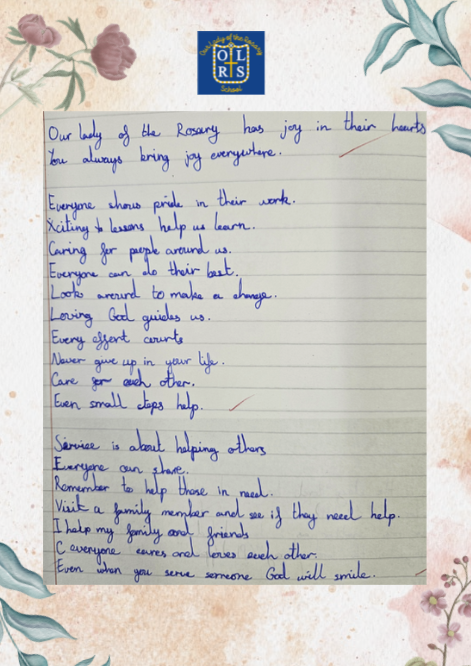 At Our Lady of the Rosary, we are a school with a strong moral purpose. We will support the spiritual and faith journey of each person and their family, which reflects the values and teachings of the Church in the light of the Gospel. We will ensure that compassion and forgiveness are strong, forever present in all that we do. At Our Lady of the Rosary, we will follow the example of Christ and in so doing, treat our children, families and staff with dignity and respect.