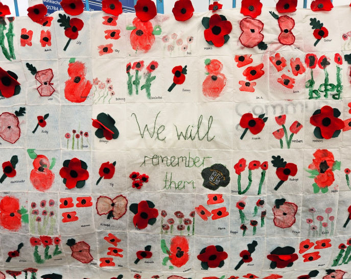 Every child in the school contributed to a special poppy art installation, with pupils painting or sewing their own poppy. The final display brought the whole school’s work together as a shared act of remembrance.