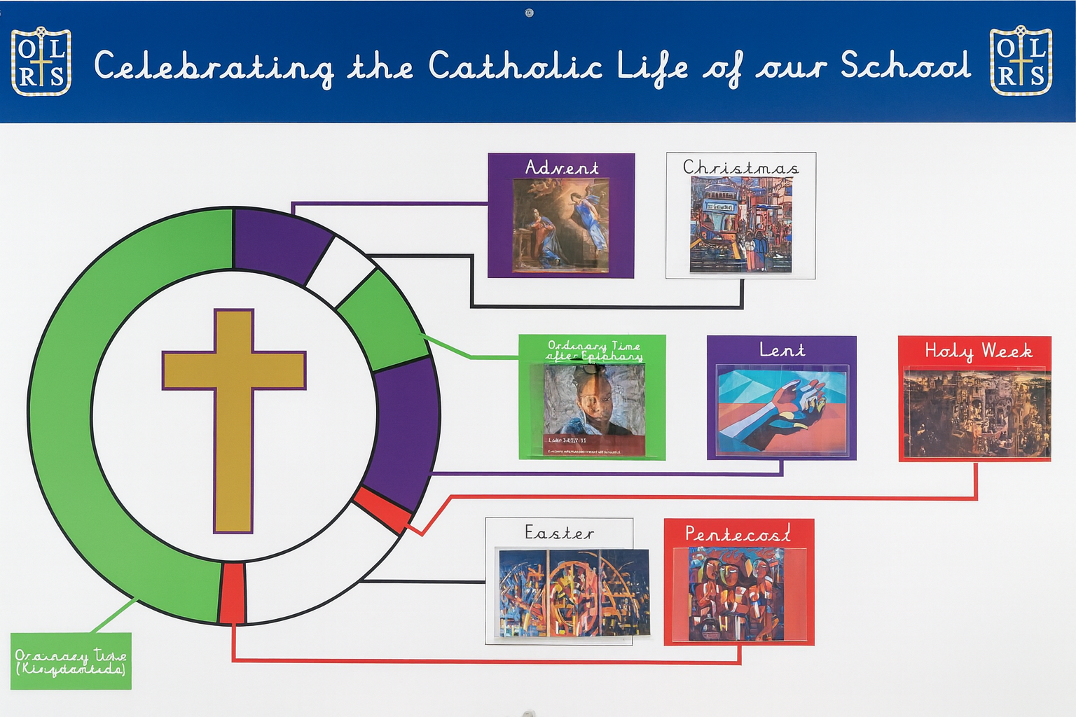 The Catholic liturgical year is the Church’s calendar of worship, guiding us through the story of Jesus and the mystery of God’s love. Rather than simply marking dates, it invites us to live the life of Christ, from His birth and ministry to His death, resurrection and the sending of the Holy Spirit. Each season has its own scripture readings, prayers, music and colours, helping us to focus on a particular aspect of our faith and to grow closer to God. This yearly rhythm of celebration and reflection shapes our prayer, our school life and our shared journey as a community of faith.